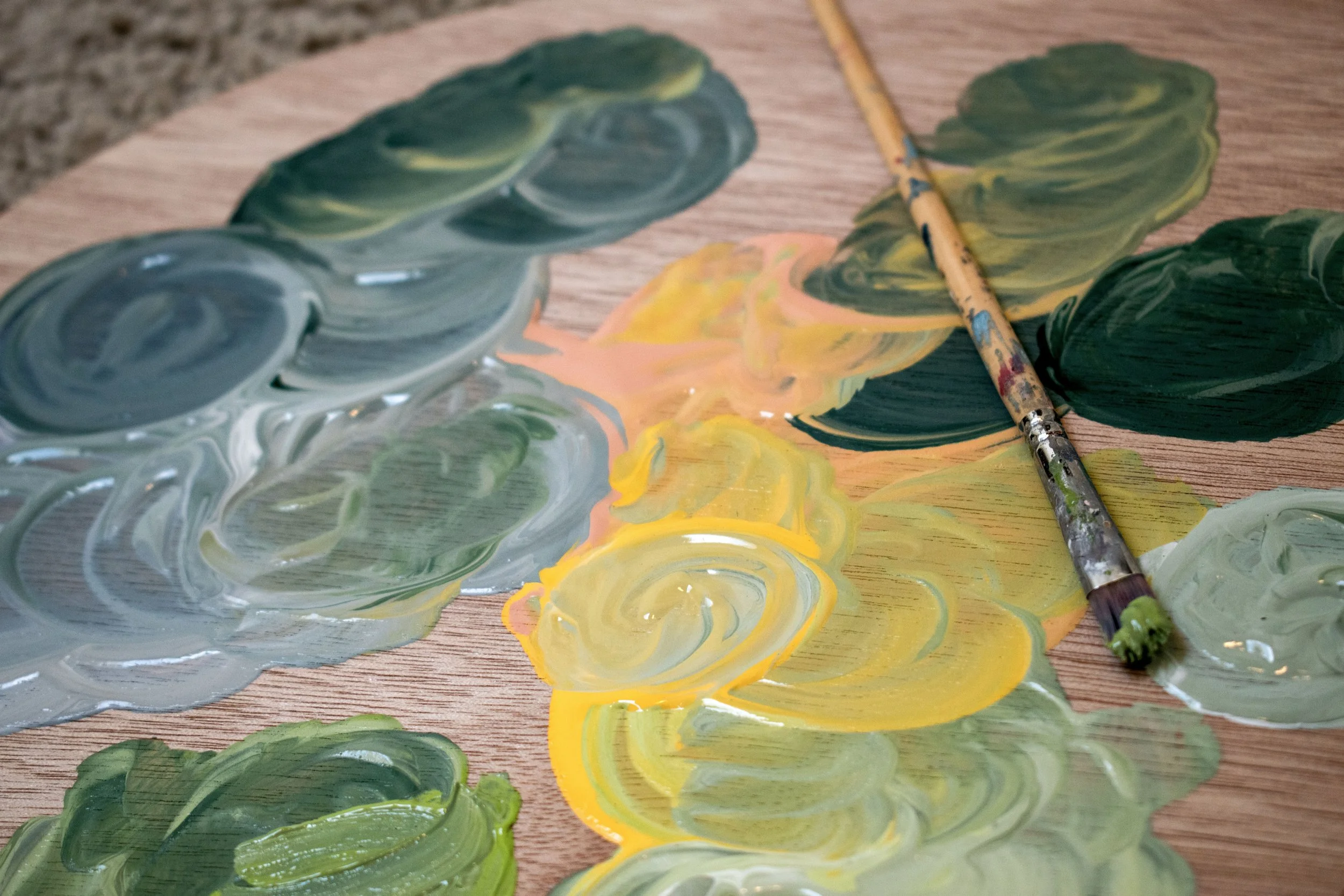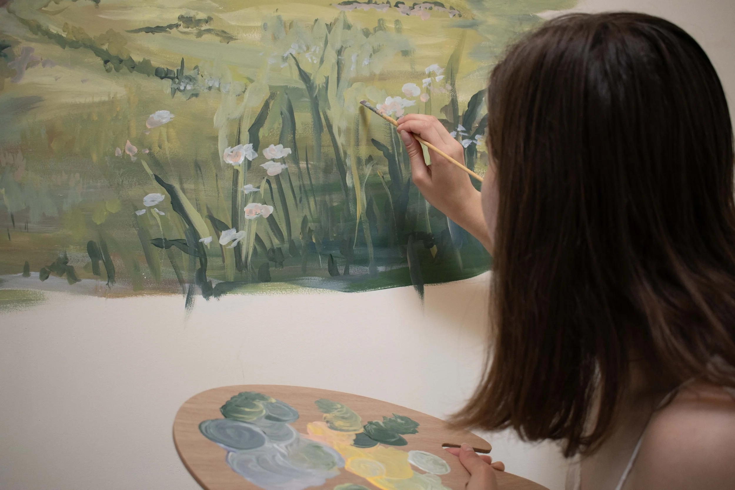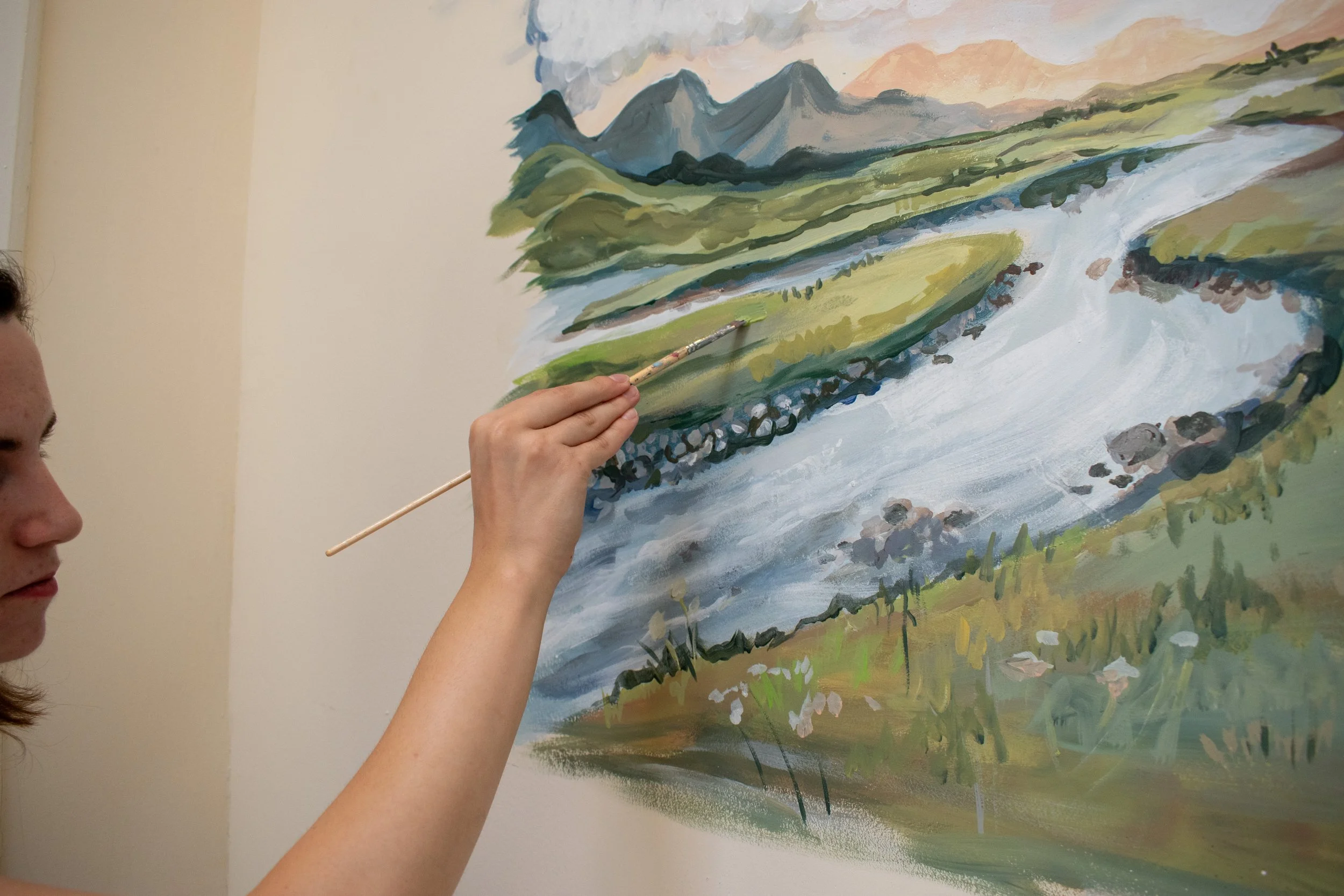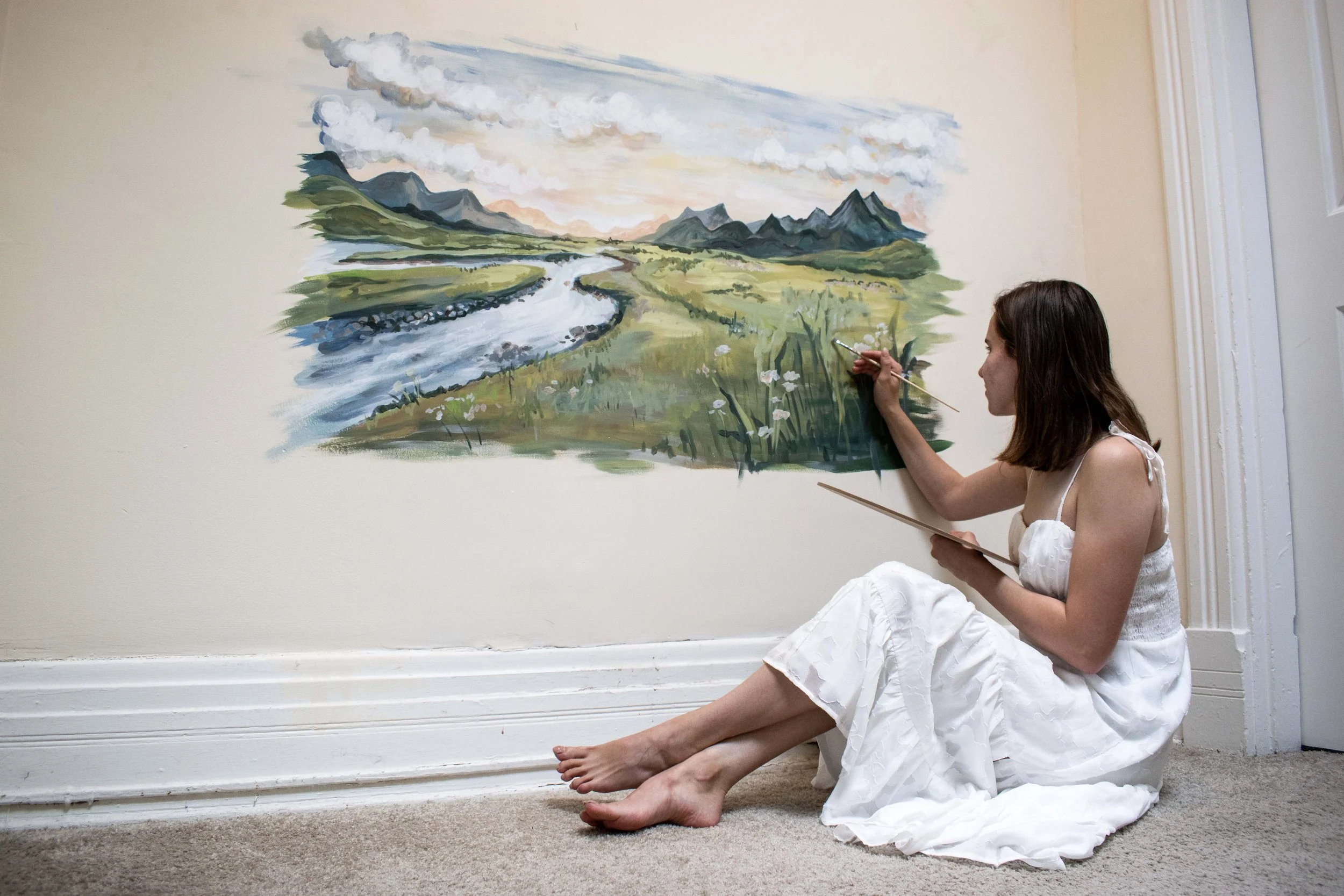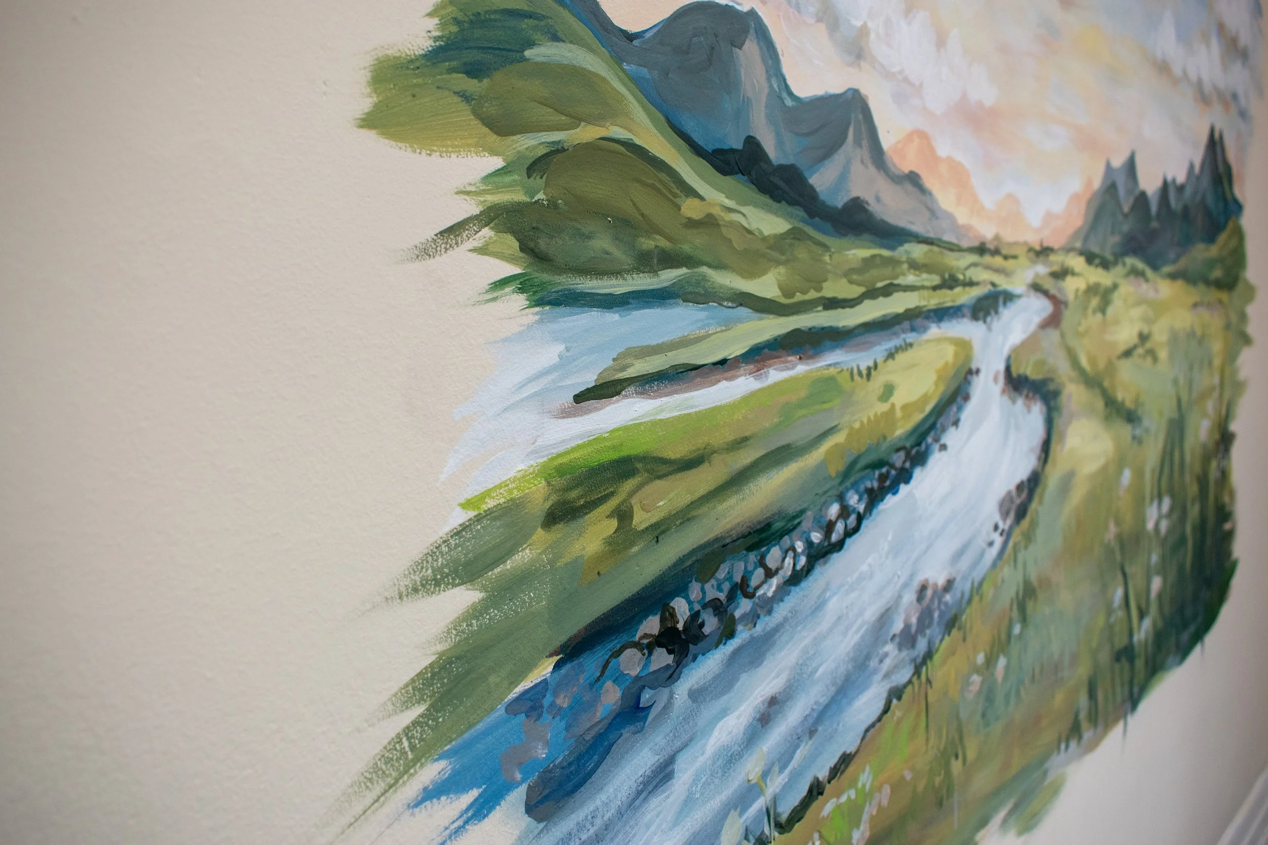 I started with a sketch on the wall of the reference photo above. I altered the color pallet to be less moody and more bright and clear. The edges were intentionally kept messy to loosen up the painting.