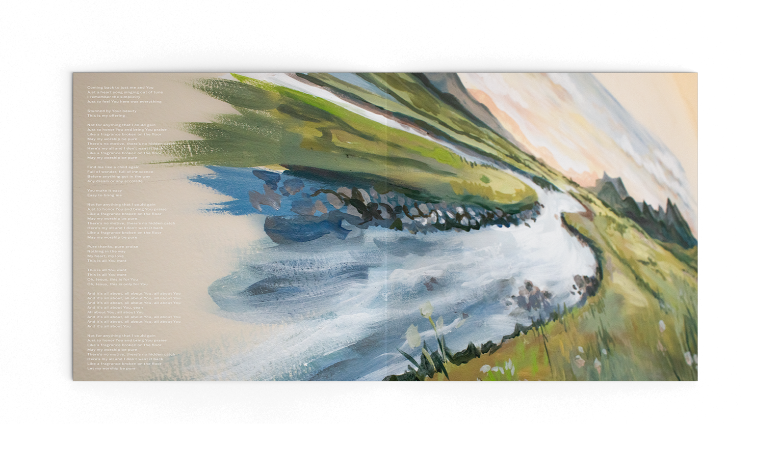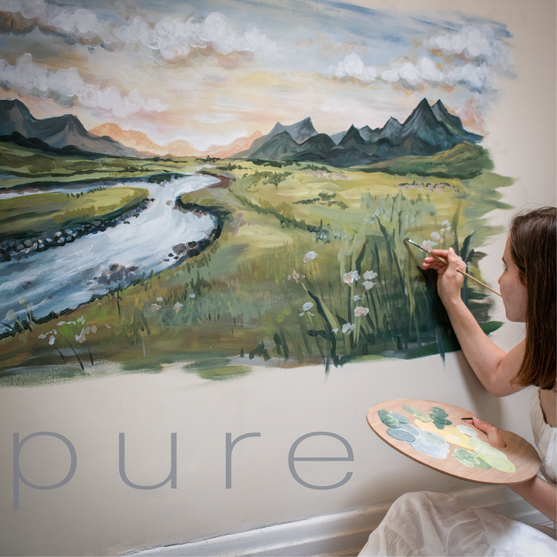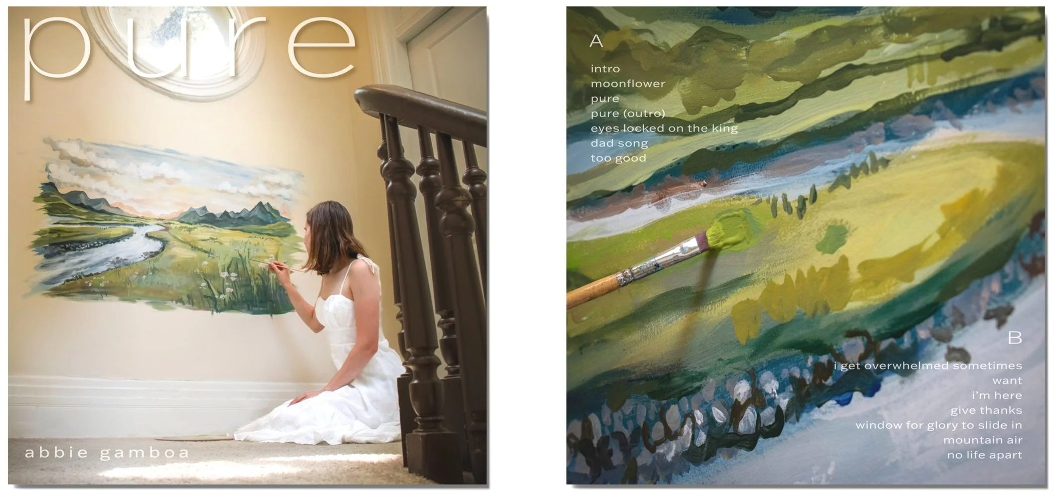 This project involved redesigning an album of our choosing in such a way that reflects the sound of the music and the feelings that it evokes. The album that I chose is called Pure by Abbie Gamboa, and it is an album full of soft worship songs. I wanted to capture the serenity of the album as well as the nods to nature through an impressionist-style landscape mural.
