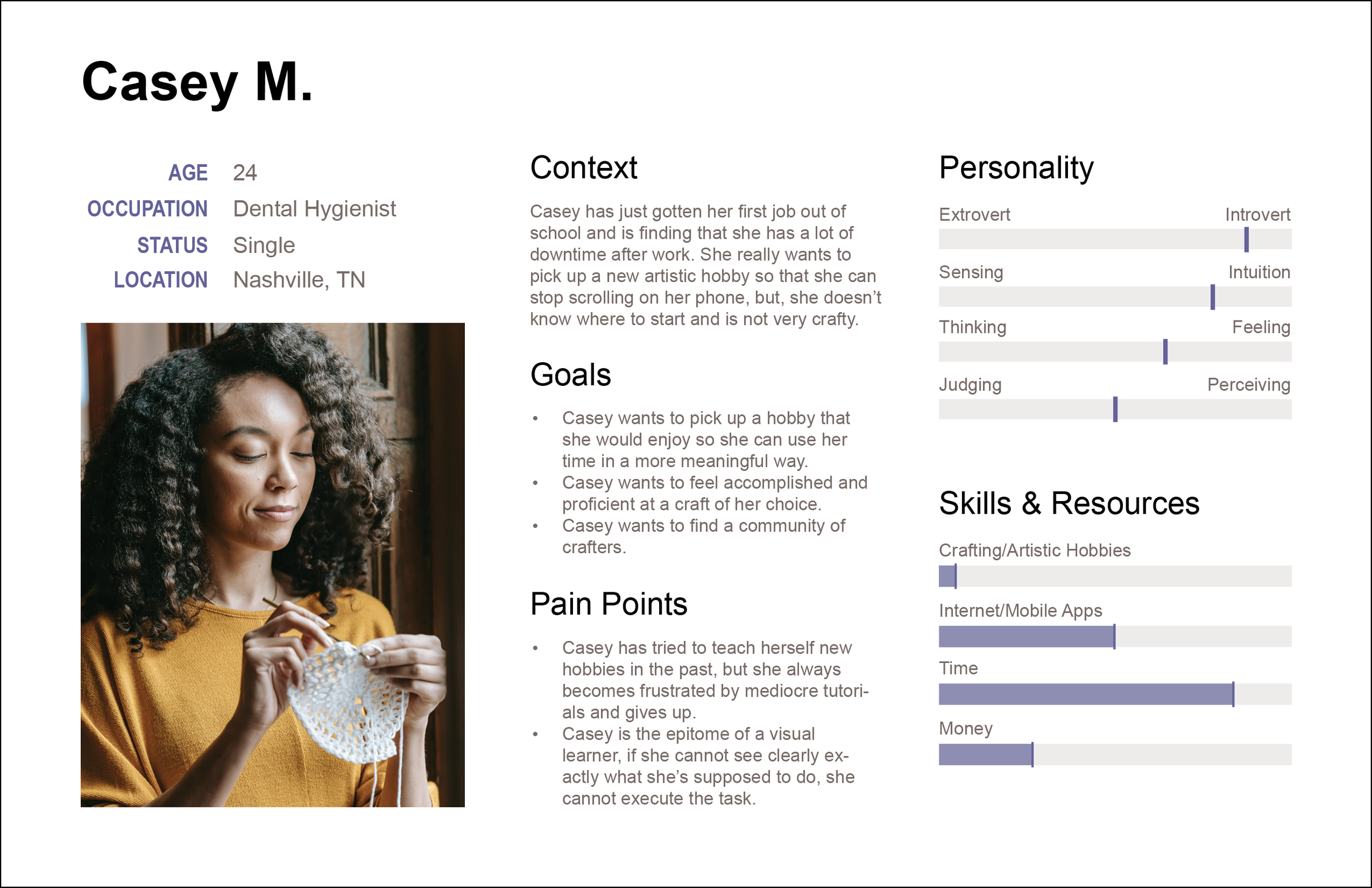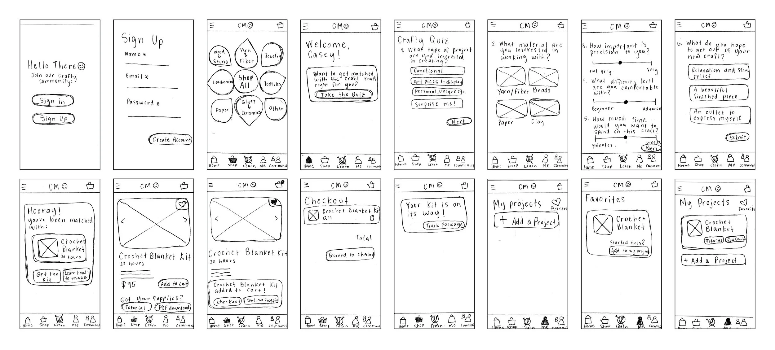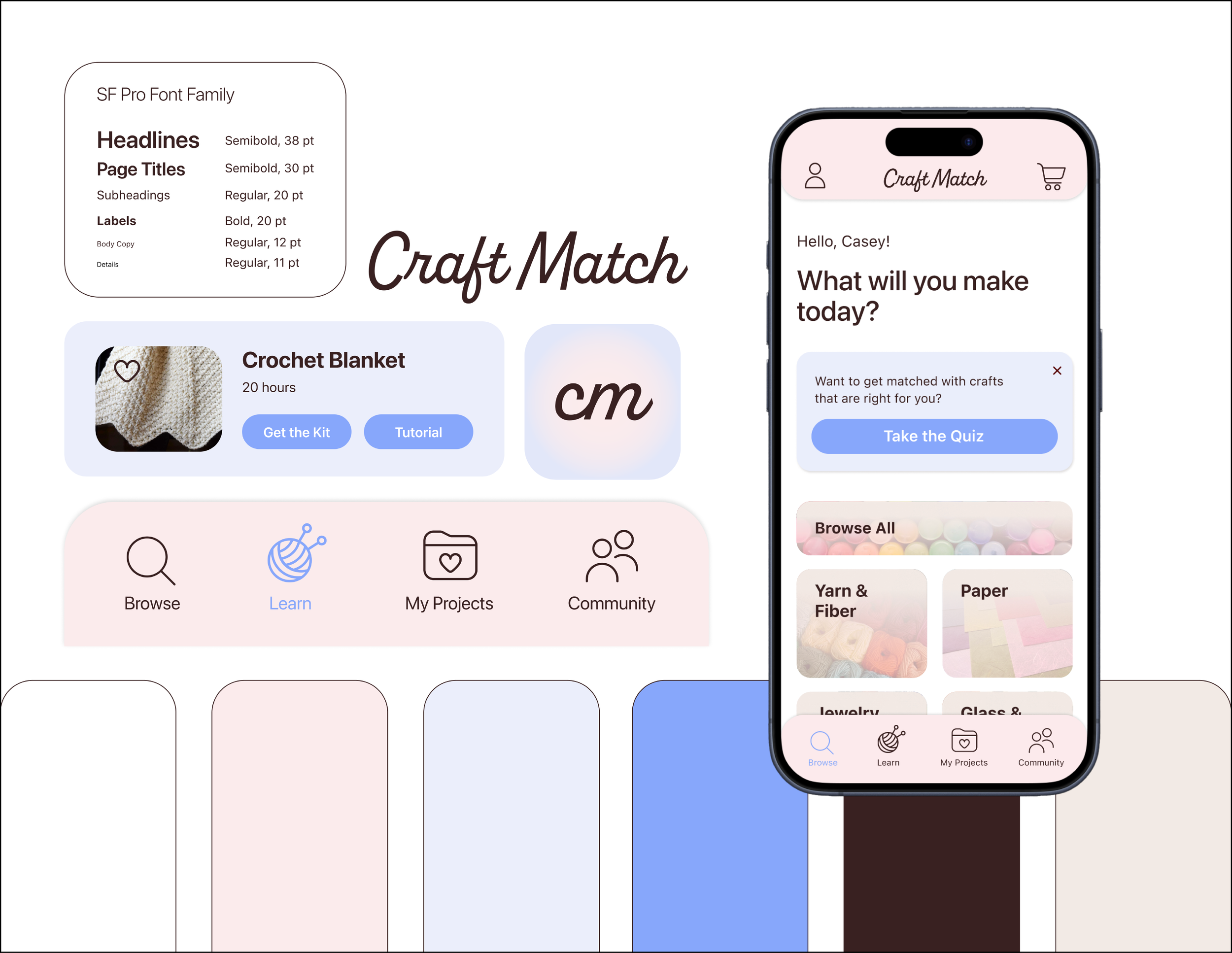 This project involved researching and building out an app. I chose to create Craft Match, a craft finding and learning app geared towards beginner crafters. The goal of the app is for the user to get matched with a craft that’s right for them and to be taught how to make their own project. Craft Match also acts as an all-inclusive crafting experience where the user can keep track of all things craft-related.
