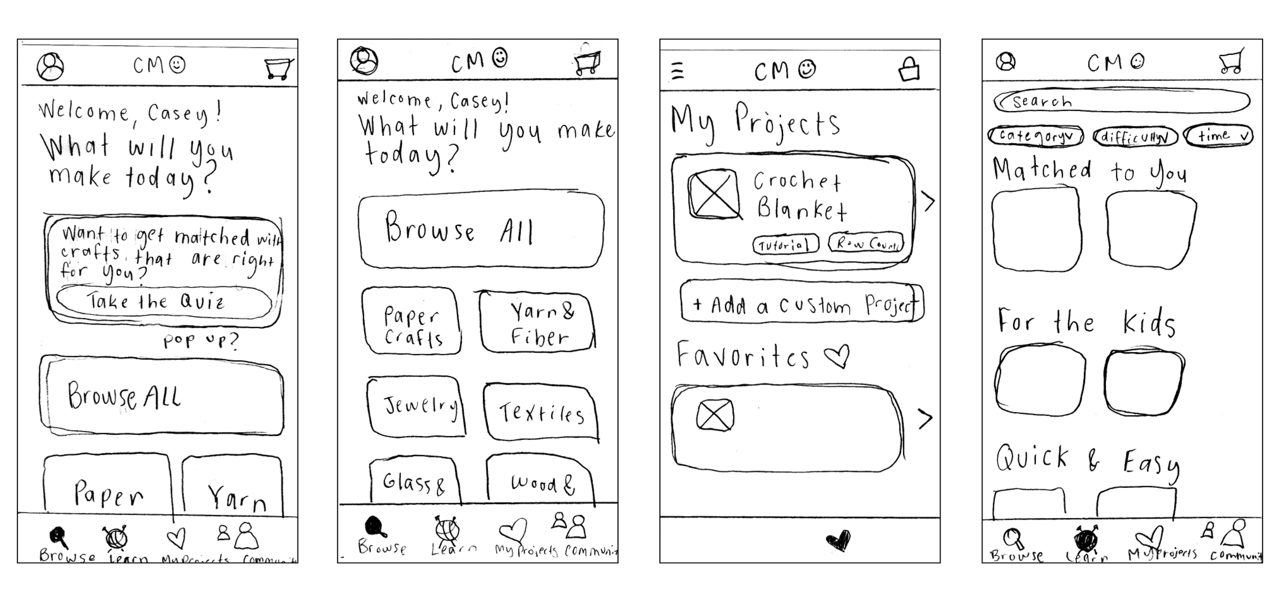 I began by sketching out individual phone screens for my classmates so that they could pretend to click through the app on paper.