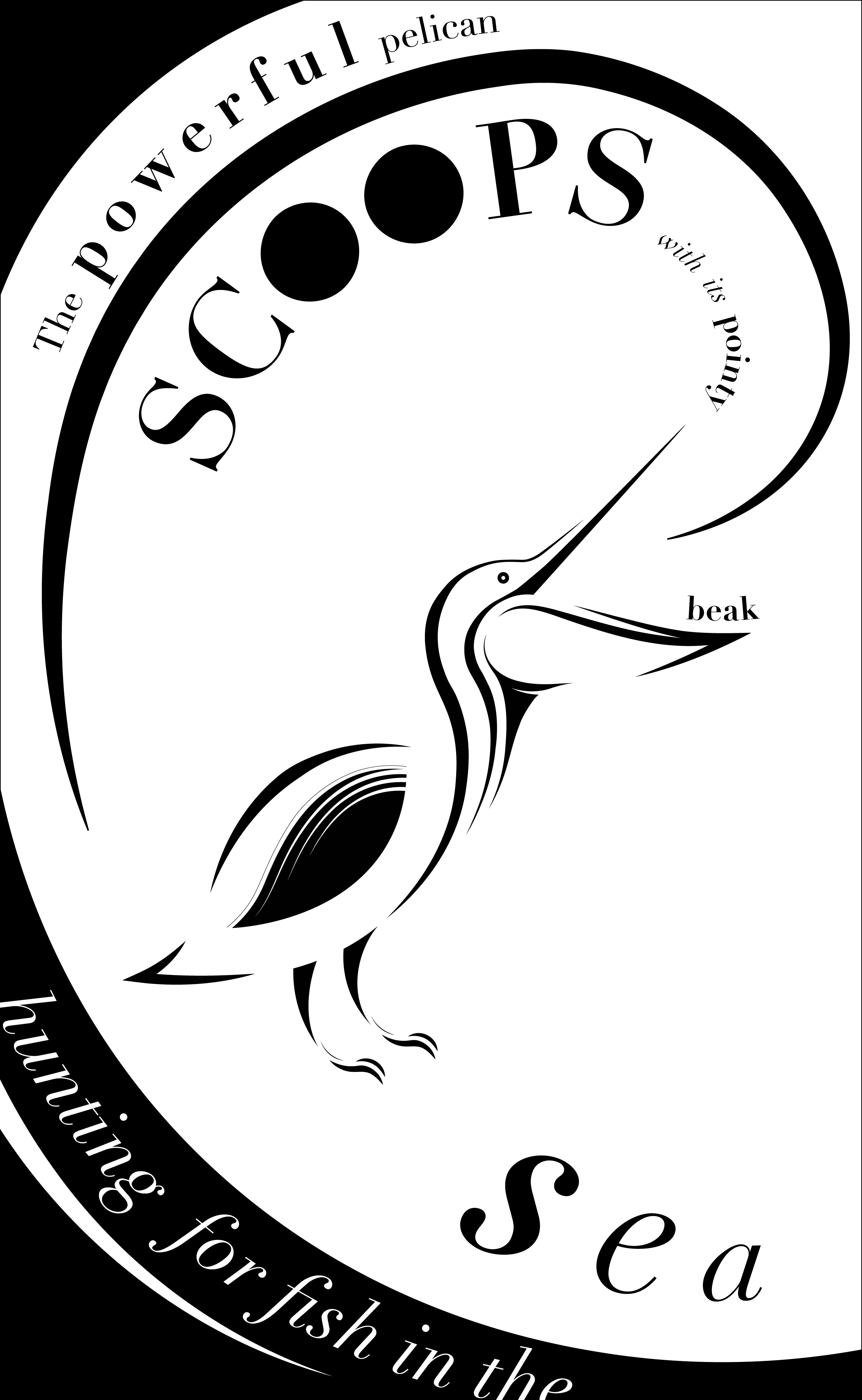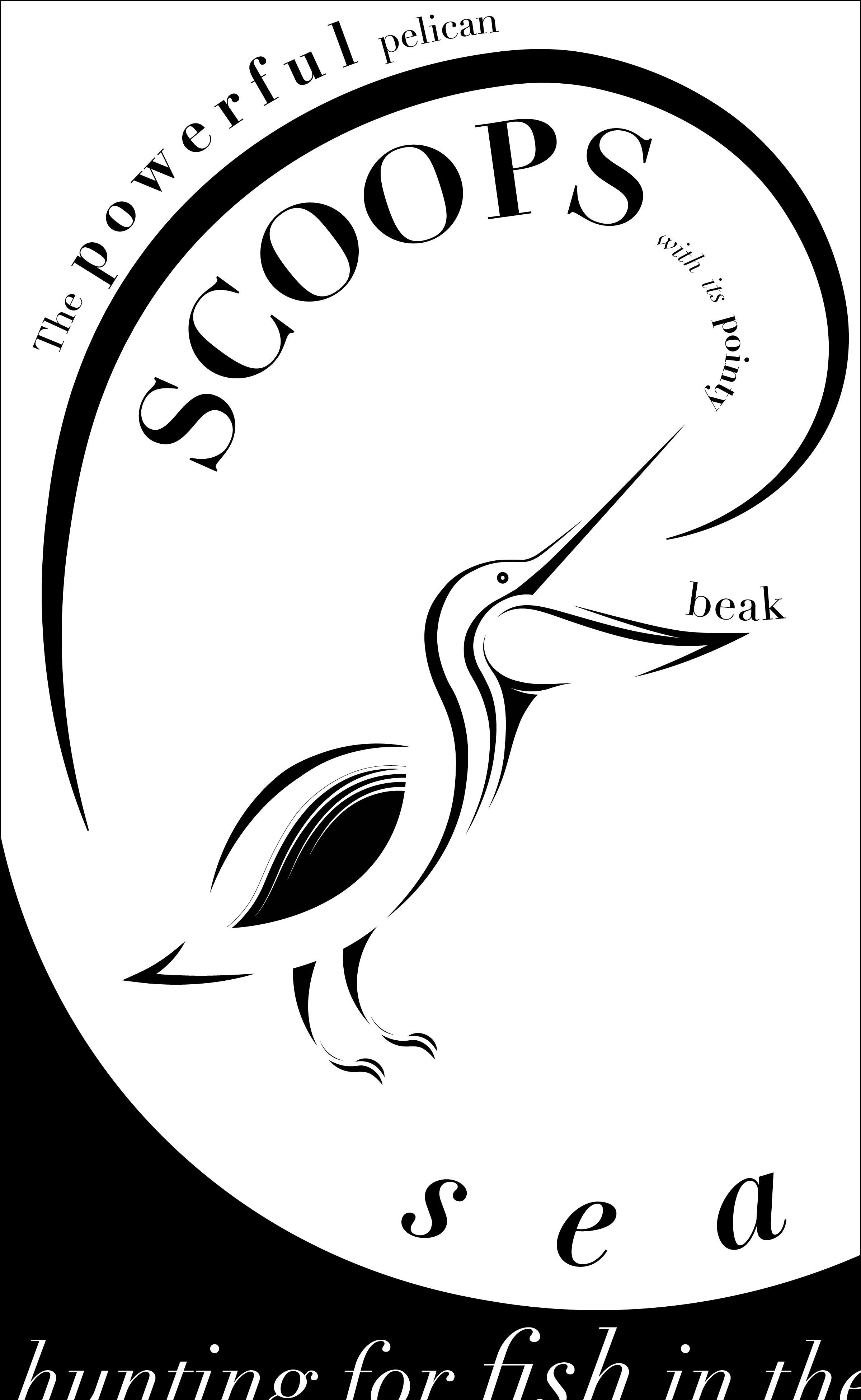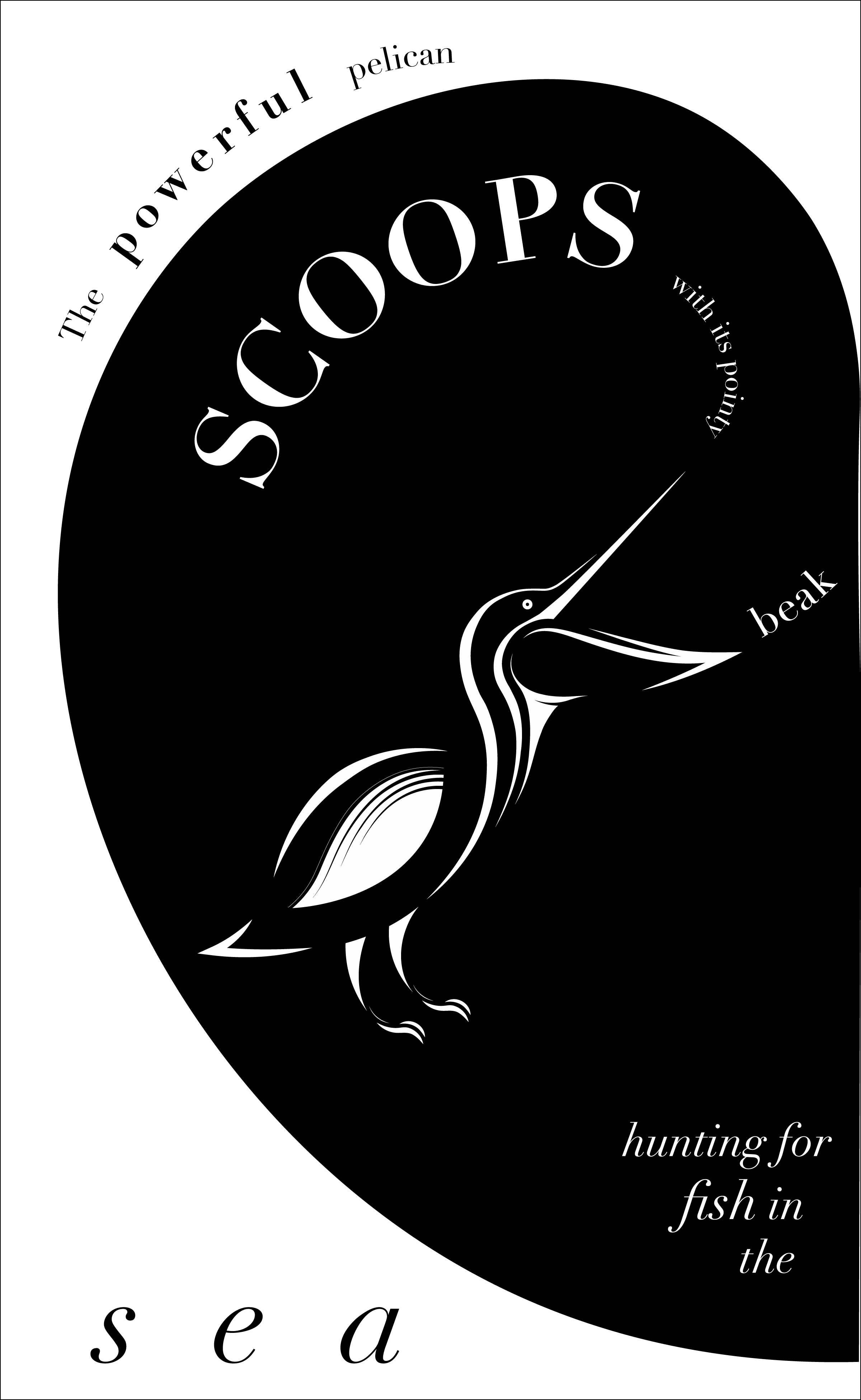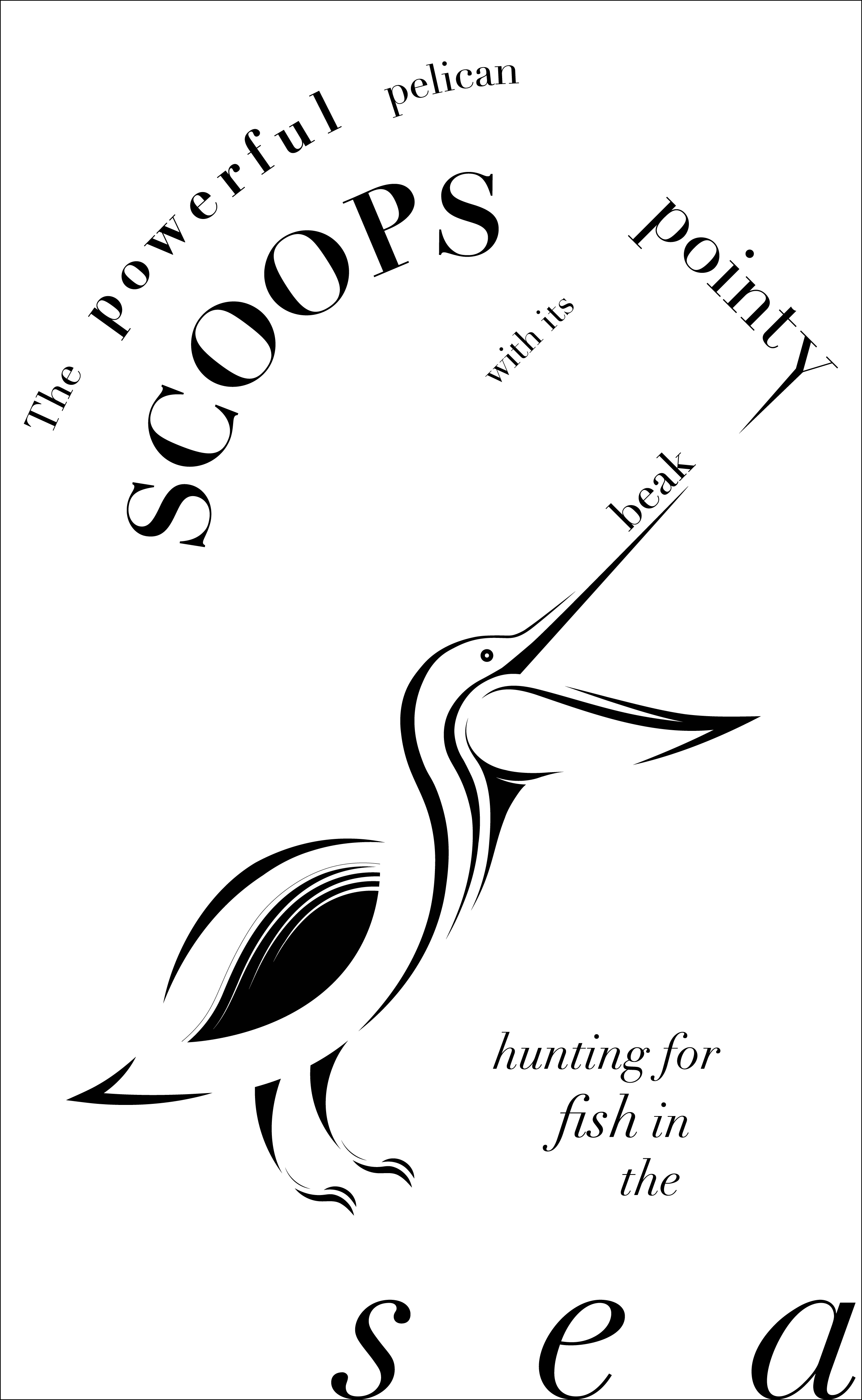 This phase of the project pushed me to be more experimental with type, specifically by using the formatting of the type to communicate a message. The message that I wanted to portray was the powerful swooping motion that the pelican makes when it hunts. The composition is meant to reflect the Fibonacci Proportion because the eye follows the curve to the focal point - the open bill.