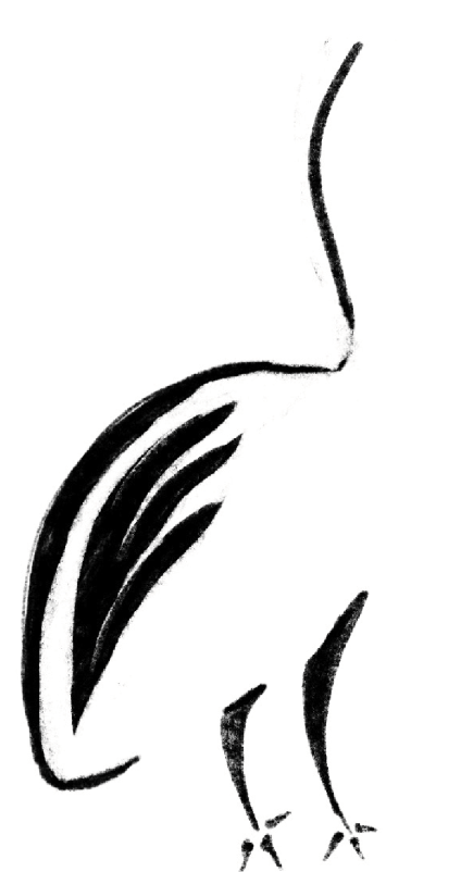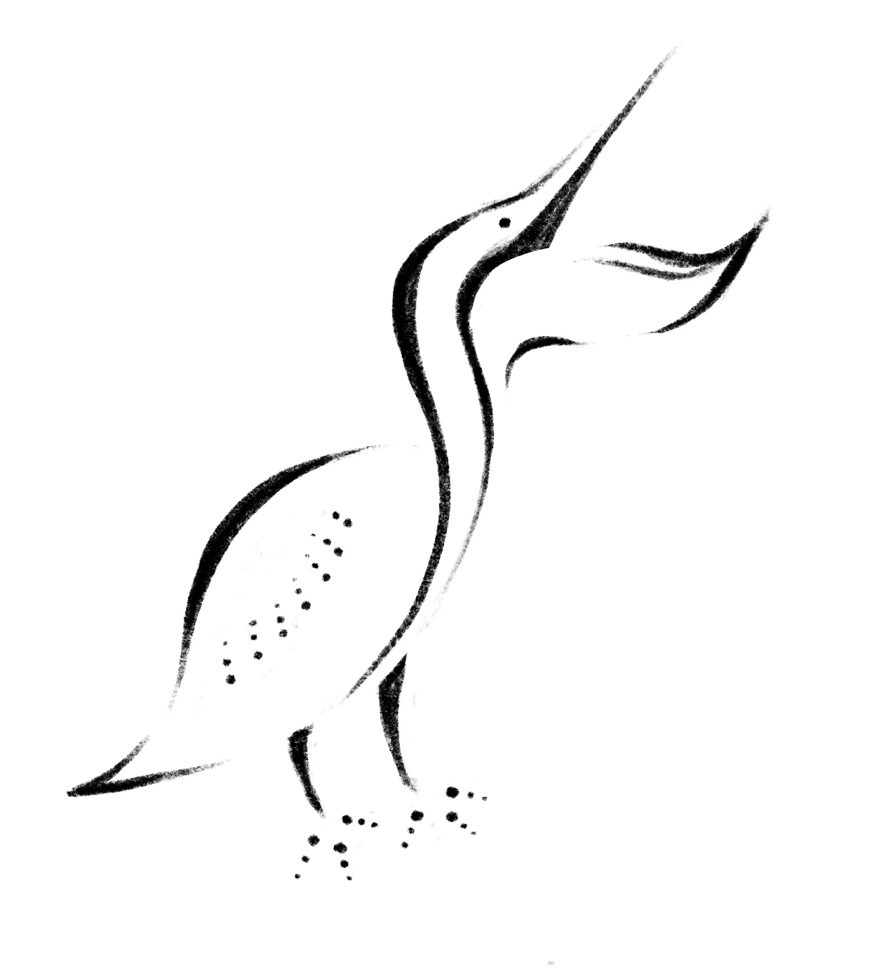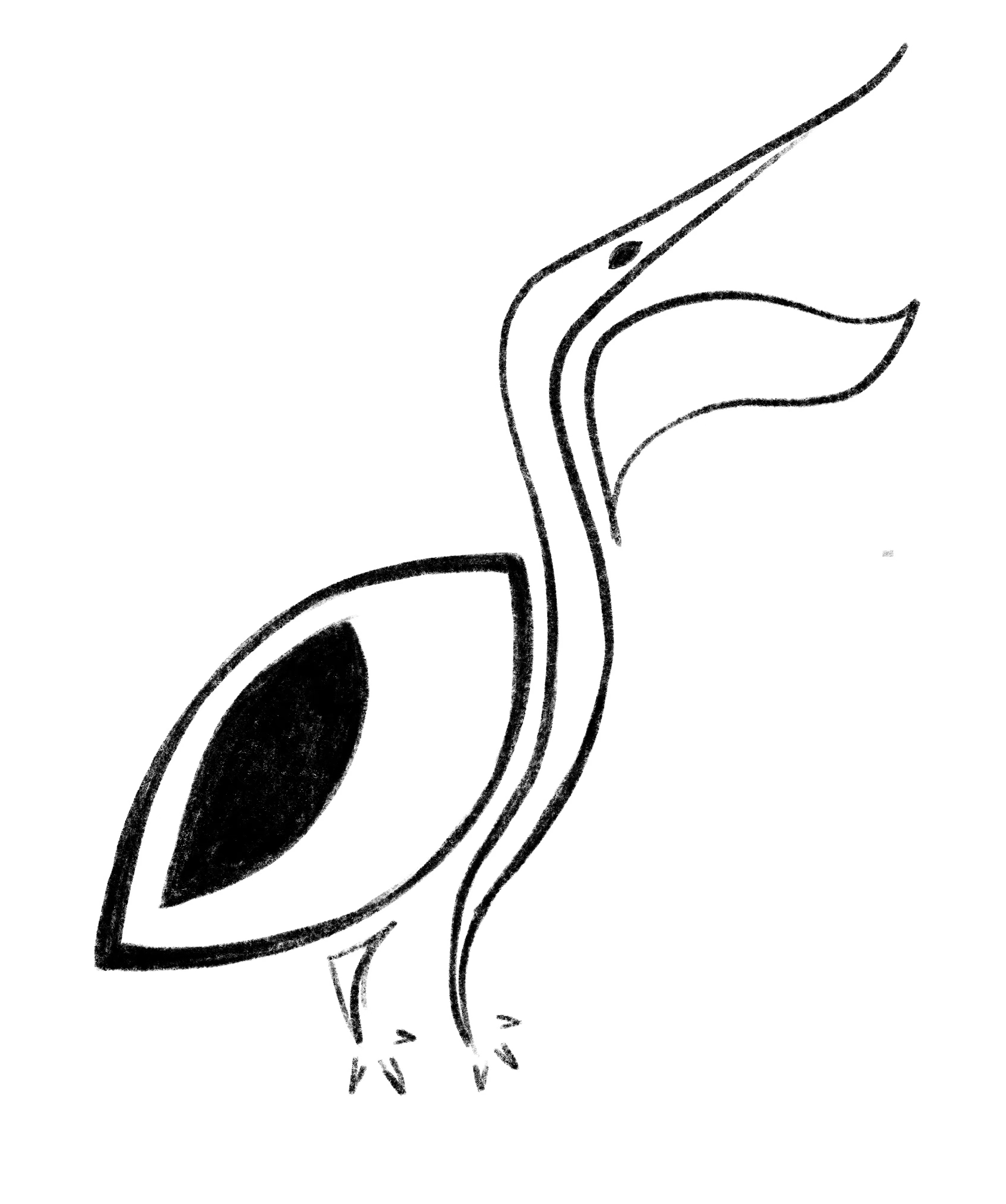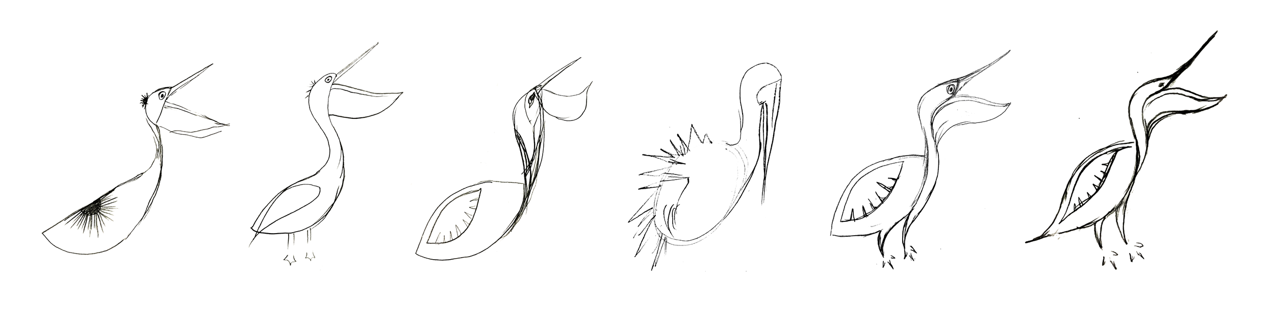 Overall, I wanted the pelican to have a consistent appearance in terms of pointy strokes of varying thicknesses, open white space, and the angle of the bird. The minute details like the white dot in the eye, the slice under the beak, and the thin curve above the feet bring elegance and help to balance out the quirkiness of the animal.